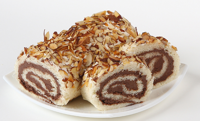 Рулет из белого бисквита, прослоенный шоколадным кремом и посыпан лепестками миндаляЛапуля(черёмуховая)