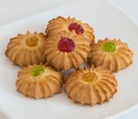 Песочное печенье, склеенное черемуховой начинкой и посыпанное сахарной пудройПесочный сочень